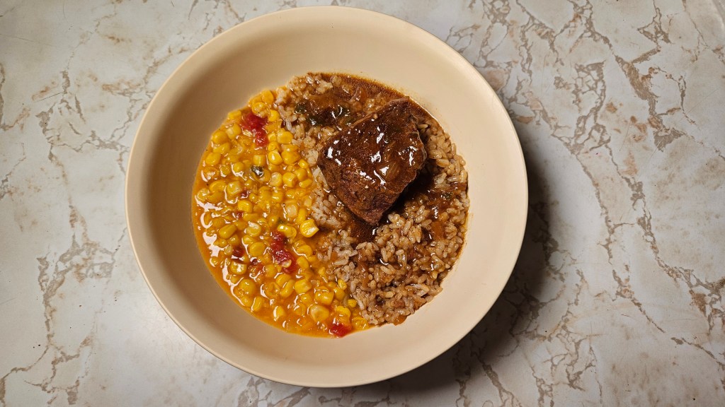 72 years old from Richard, Louisiana preparing a calf steak in a gravy & corn maque-choux