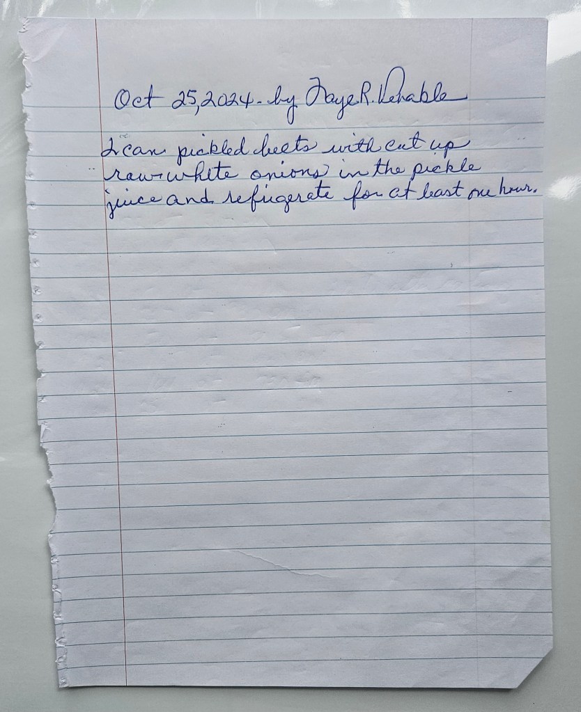 Faye prepared an additional side dish with her steak in a gravy: pickled beets. Click to listen to her instructions below.